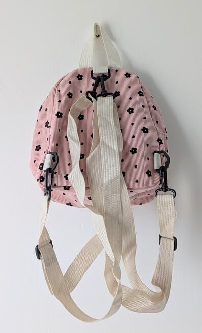 Sac à dos rose motif fleur. Bretelles réglables. 2 poches
